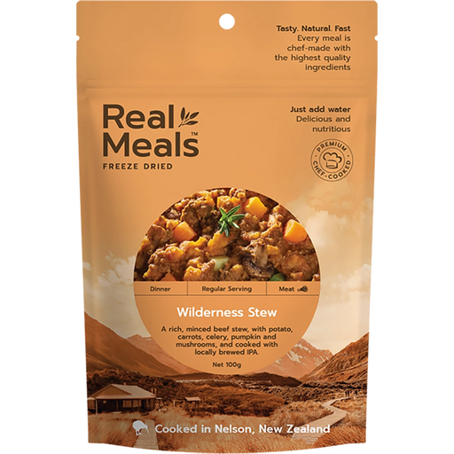 Real MealsHearty pub style beef stew for refuelling on the trail Real Meals Wilderness Stew brings a rich, savoury beef stew to your campsite with bold flavo...
