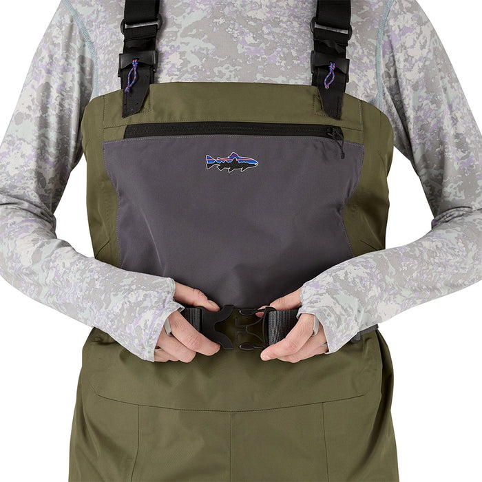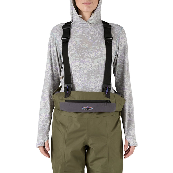 The Patagonia Women's Swiftcurrent Traverse Waders are engineered to reduce weight and bulk without sacrificing durability, making them ideal for a range of fishing environments. Constructed from a 4-layer, 5.6-oz 100% recycled polyester microfiber high-density taffeta face bonded to a 100% recycled polyester backer, these waders feature a waterproof/breathable barrier and a durable water repellent (DWR) finish made without intentionally added PFAS. The gusseted crotch with an articulated seat and legs offers ease of movement, while the easy chest-to-waist-high conversion and drop-seat system with a low-profile buckle at the center back provide convenience. Interior storage includes a large, stretch zippered security pocket and a quick-access drop-in pocket, complemented by an extra-large, zippered stretch stash chest pocket on the exterior. Articulated legs with heavy-duty scuff guards at the ankles enhance abrasion resistance, and anatomical booties offer a sock-like fit for all-day comfort. Made in a Fair Trade Certified factory, these waders reflect Patagonia's commitment to ethical manufacturing.