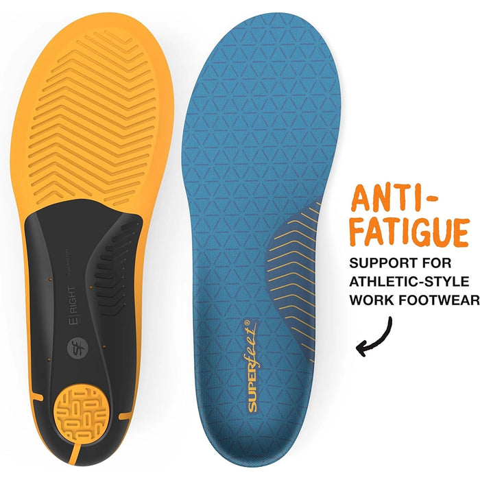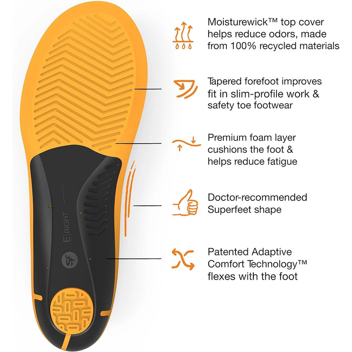 Superfeet's Work Slim Fit Cushion insoles are engineered to provide durable, anti-fatigue support for individuals who spend long hours on their feet. Designed with a slim profile, these insoles fit well in snug fitting and athletic style work shoes, even some without removable liners. The premium foam layer guards against foot fatigue, while the Moisturewick top cover helps reduce odours, keeping feet fresh. Ideal for those in industries such as construction, manufacturing, healthcare, or hospitality, these insoles can be trimmed to fit your shoe size.