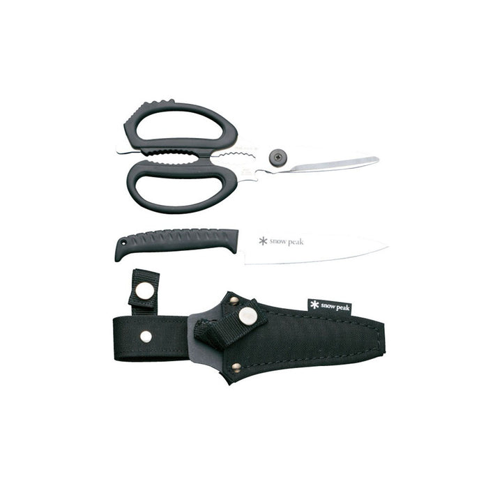 The Snow Peak Kitchen Scissors Set is a versatile and compact solution for both indoor and outdoor cooking enthusiasts. This Japanese-designed set includes a pair of stainless steel scissors that function as a garlic press, bottle opener, meat tenderizer, and nutcracker, along with a small paring knife. Each component is crafted with precision, ensuring durability and ease of use. The set comes with a convenient carrying case, making it an essential addition to any camp kitchen or home setup.